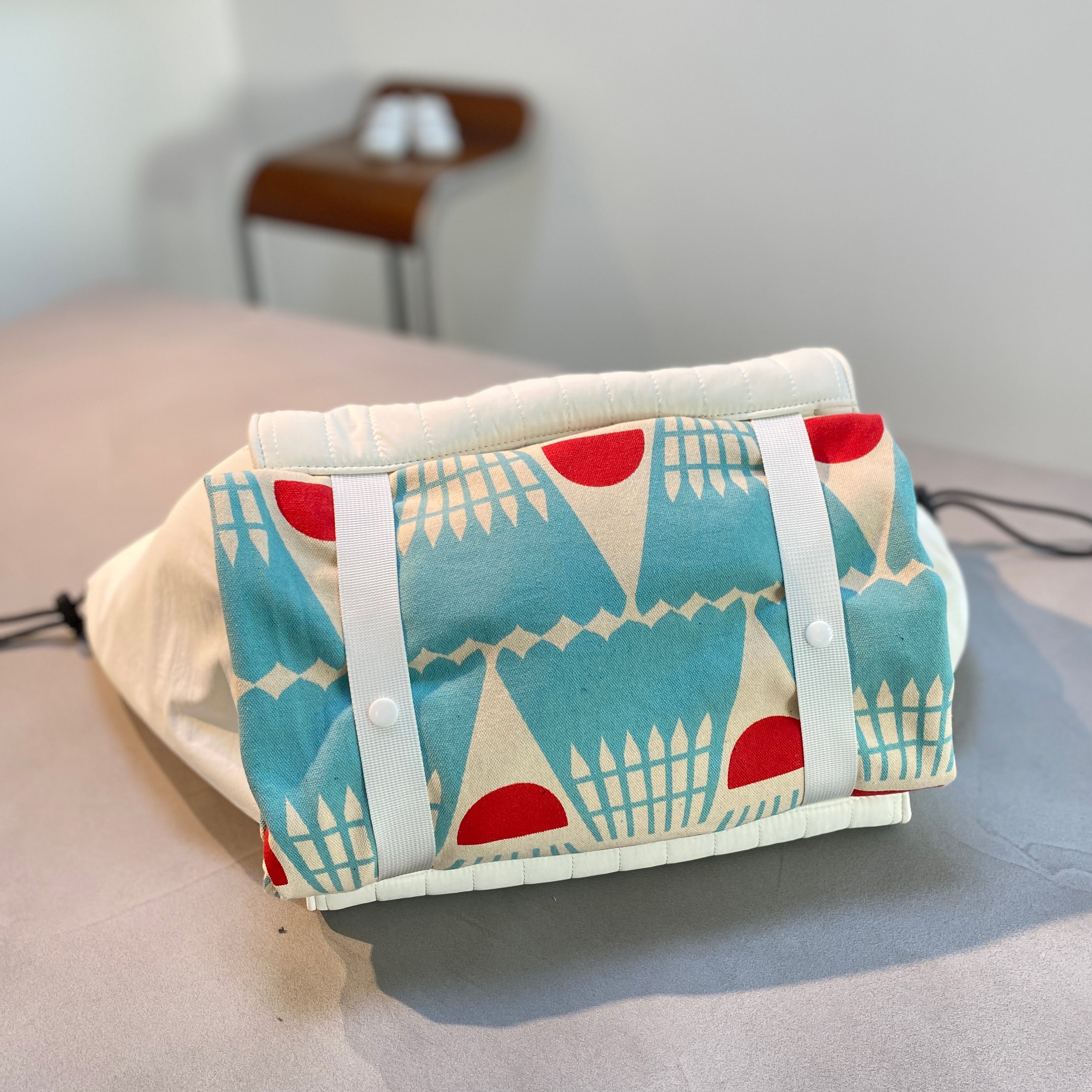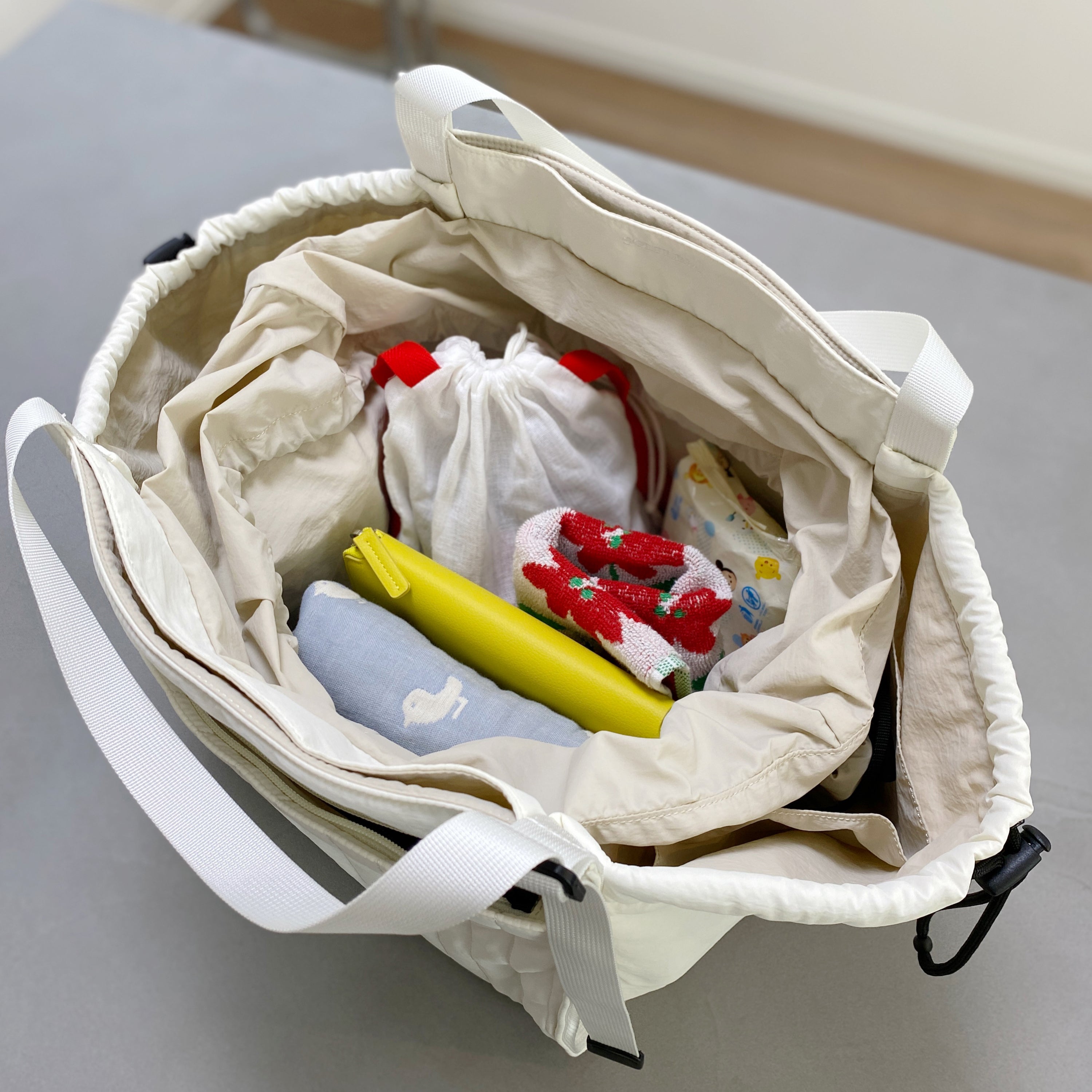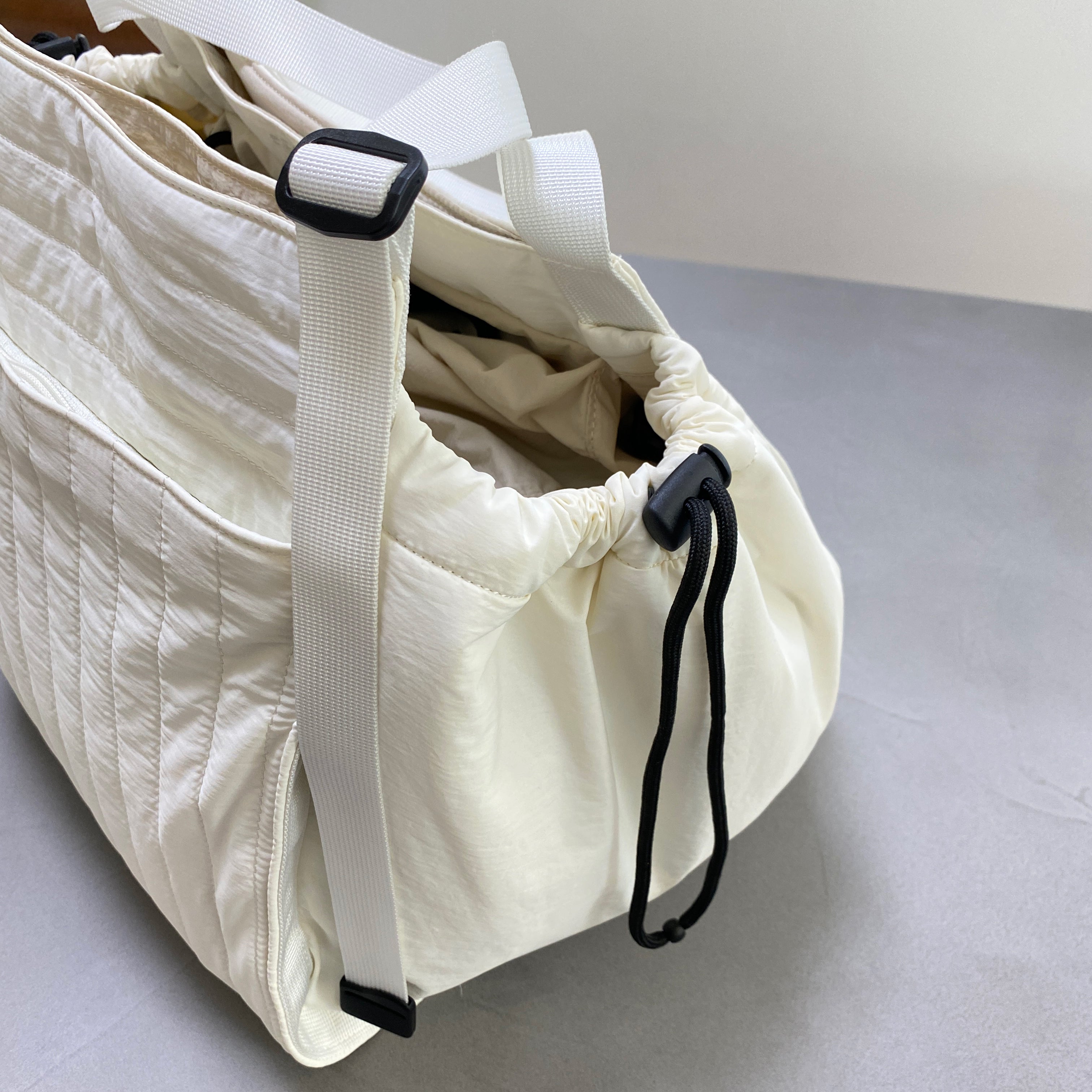 キルティングのステッチがデザインのポイントになっている、丈夫で軽量なトートバッグ。マチ幅がしっかりとあるので大きめの荷物も収納できて、バッグがしっかりと自立するので荷物の出し入れもスムーズです。口元は巾着型になっているので、中身が丸見えにならず、荷物を落とす心配もありません。